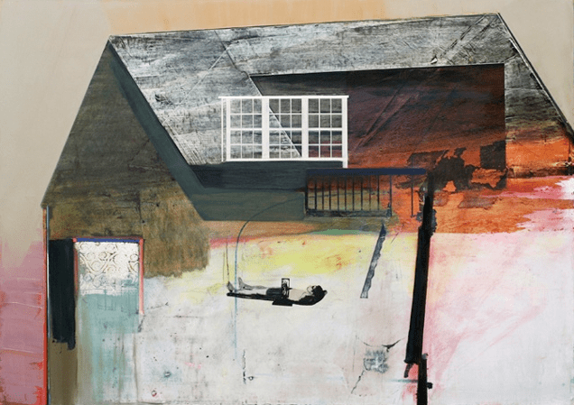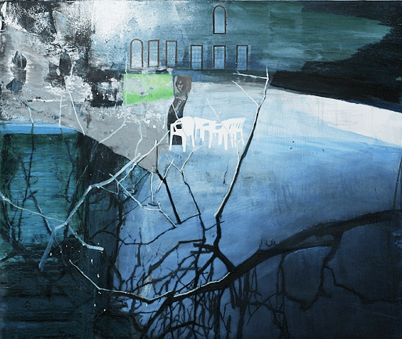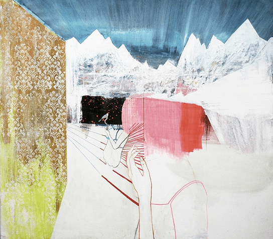 3 Berlin / Silkscreen, mixed media on paper / 14"x17" / 2009 Bird and the Mountains / Oil on canvas / 60"x67" / 2008 Pool House / Silkscreen, oil on canvas / 38"x45" / 2008 Staircase / Oil on canvas / 32"x45" / 2009