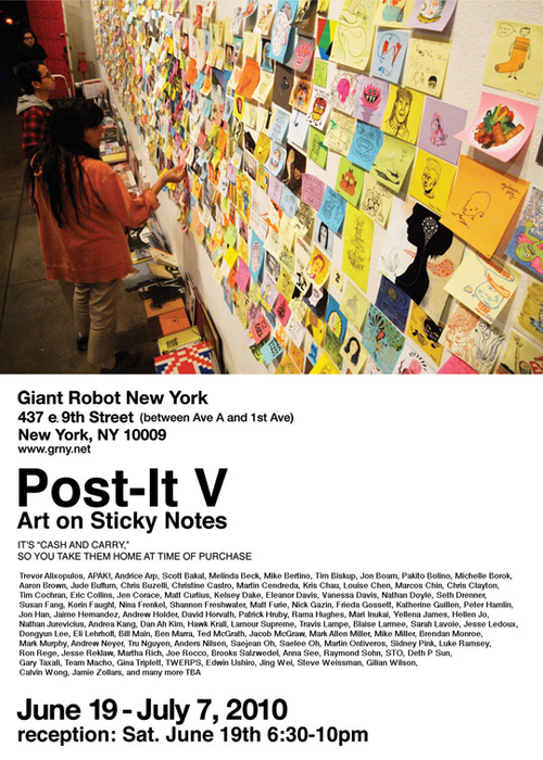 Post-It V Post-It V, opens tonight at Giant Robot in New York and runs until July 7. Share on Pinterest (Opens in new window) Pinterest Share on X (Opens in new window) X Share on Facebook (Opens in new window) Facebook Related